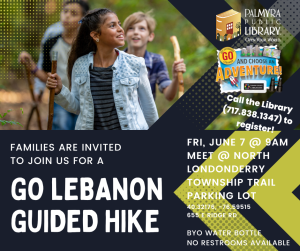 Friday, June 7 – 9am – Meet us at the North Londonderry Township trails (40.32176, -76.59515; 655 E Ridge Rd) for a guided GO Lebanon hike. Register for the GO Lebanon program and this guided hike prior to the program by coming to the Library to pick-up your guidebook. Call the Library (717.838.1347) to register for this guided hike if you have already picked up your guidebook. Bring your own water bottle. There are no restrooms available at this trail.