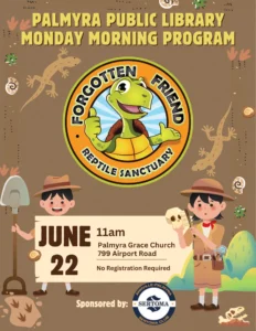 Join us at Palmyra Grace Church (799 Airport Rd, Palmyra) for the Summer Family Program on Monday, June 22 at 11am! Get ready to learn about reptiles as we welcome Forgotten Friend Reptile Sanctuary. No registration required.